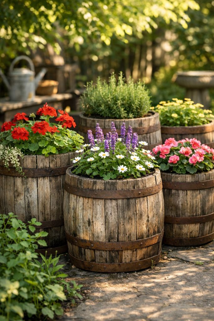 Grab an old whiskey or wine barrel—they make fantastic planters. The aged wood brings a ton of character to any corner of your yard.