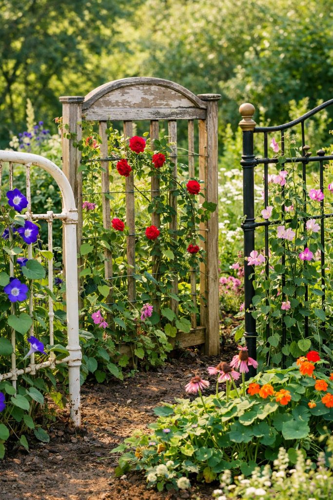 Turn an old bed frame into a trellis for climbing plants. Beans, peas, or flowering vines like clematis love the extra support.