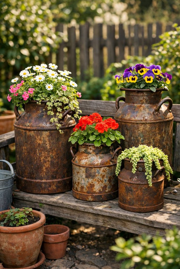 Vintage metal milk jugs make charming planters. Their rustic look brings instant vintage character.