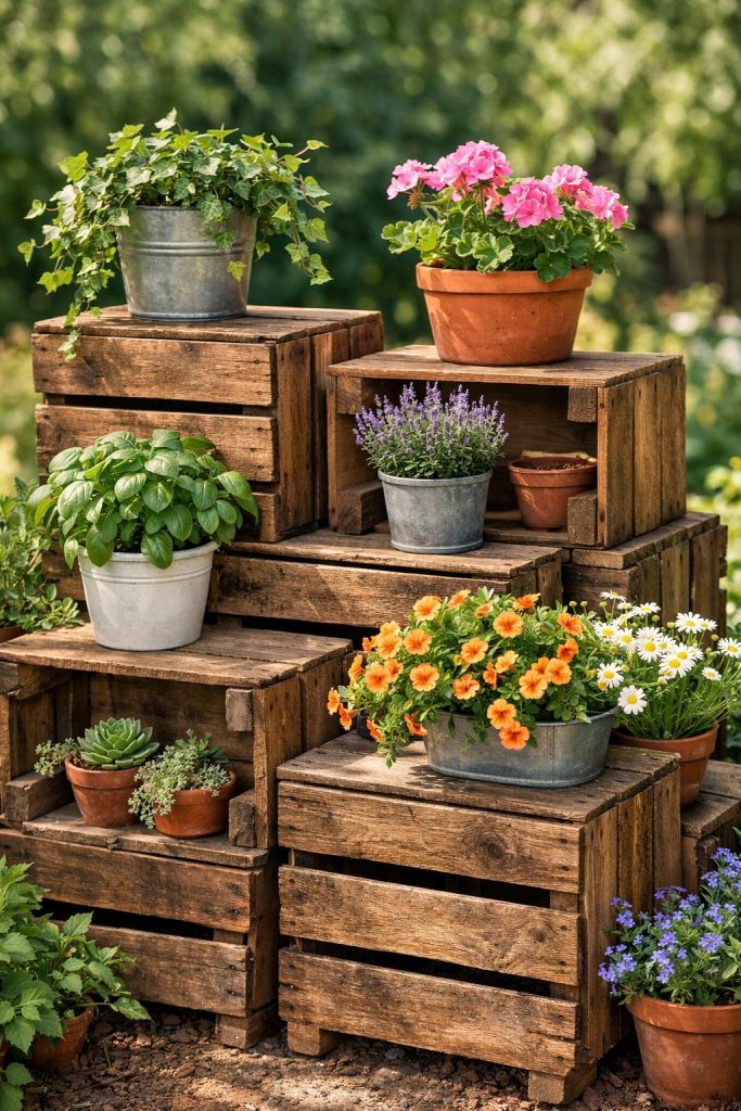 Stack old wooden crates at different heights for a vintage display that’s both practical and charming. They give your plants a boost and add rustic personality.