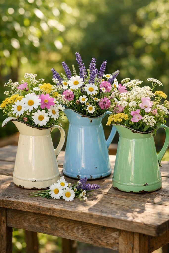 Vintage enamelware pitchers make adorable vases for garden flowers. Their rustic style looks right at home on a kitchen table or even a bedroom dresser.