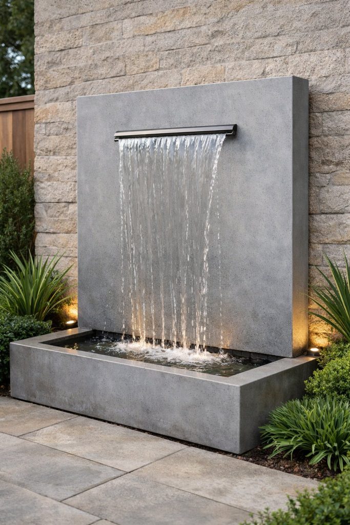 A concrete slab fountain gives your wall clean lines and a no-nonsense modern look. The smooth face keeps things simple and uncluttered.