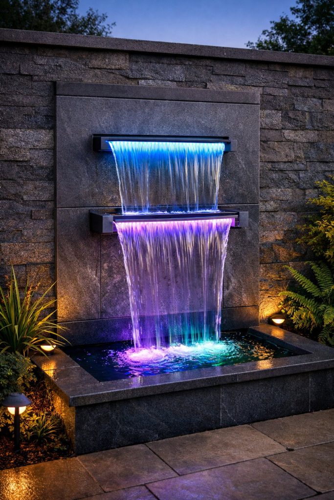 You can turn your outdoor space into a nighttime showpiece with an LED-lit glass panel fountain. Water runs down the clear surface while built-in lights make the whole thing glow after dark.