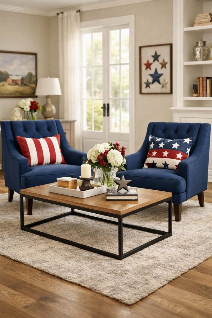 Navy blue accent chairs bring a patriotic vibe without making things feel too busy. Pick velvet or linen upholstery to suit your comfort.