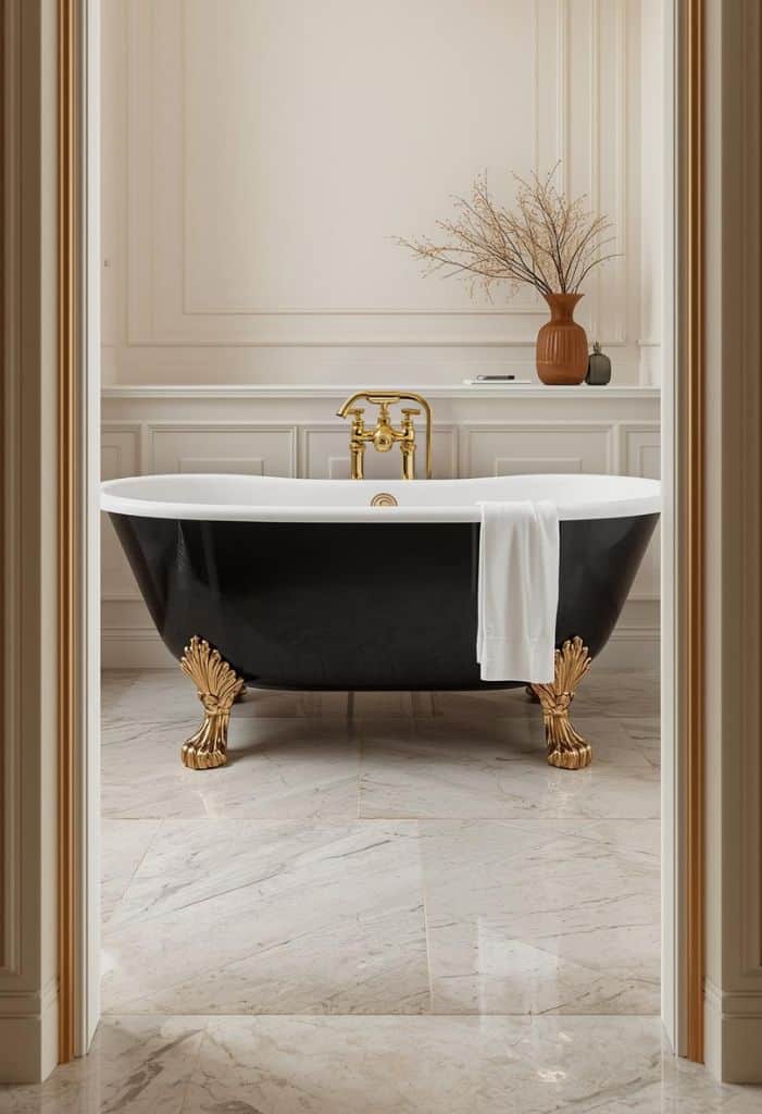 A freestanding bathtub in black with gold accents becomes the star of any bathroom. Go for a classic claw-foot tub with gold feet or a modern oval design with gold trim.