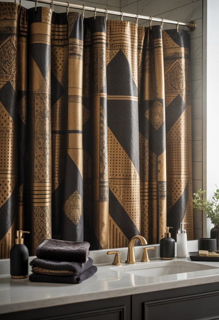 A black and gold geometric shower curtain instantly boosts your bathroom’s style. It mixes luxury with a modern twist.