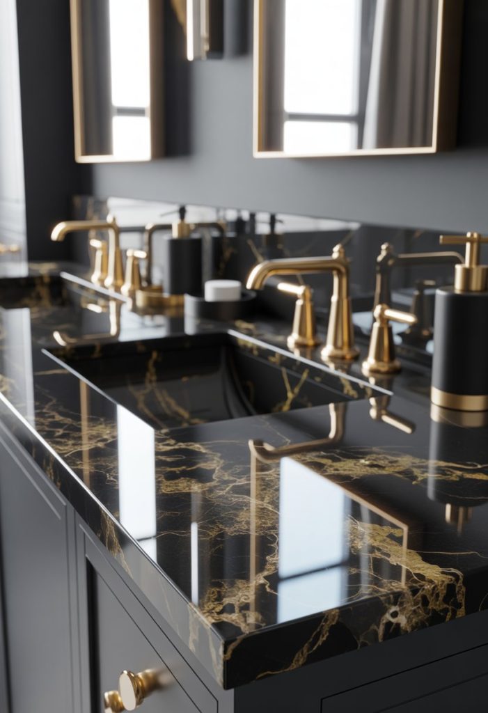 Black marble countertops with gold veining make a bold statement. The natural gold streaks running through the dark marble look dramatic and elegant.