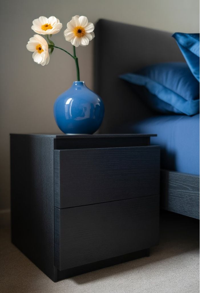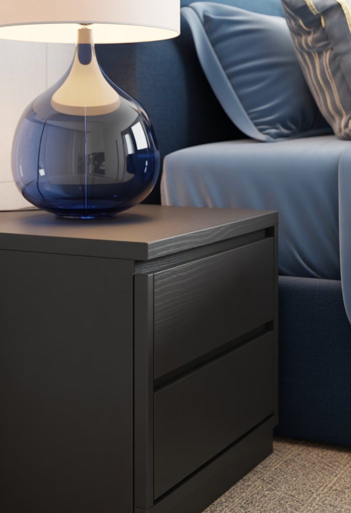 You’ll find all kinds of black nightstands at IKEA and similar spots, from bare-bones to fancy. For the lamp, look for a blue glass base with a white shade to keep things balanced.