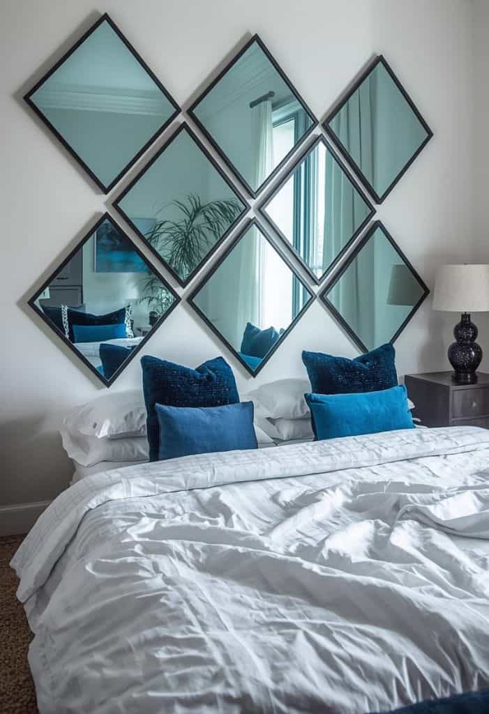 Try grouping small blue-tinted mirrors in a geometric layout for a modern feel. This combo ties in with other black and blue details around the room.