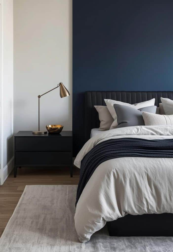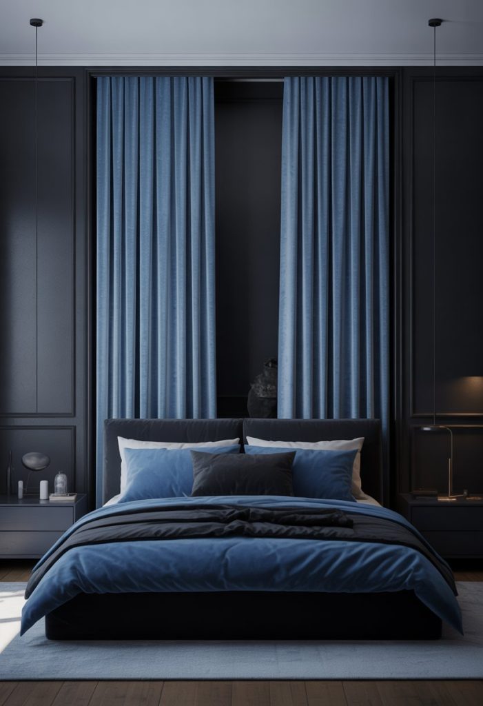 Mixing black and blue elements in your bedroom sets a calming, dramatic mood that works for relaxing or making a bold design statement.