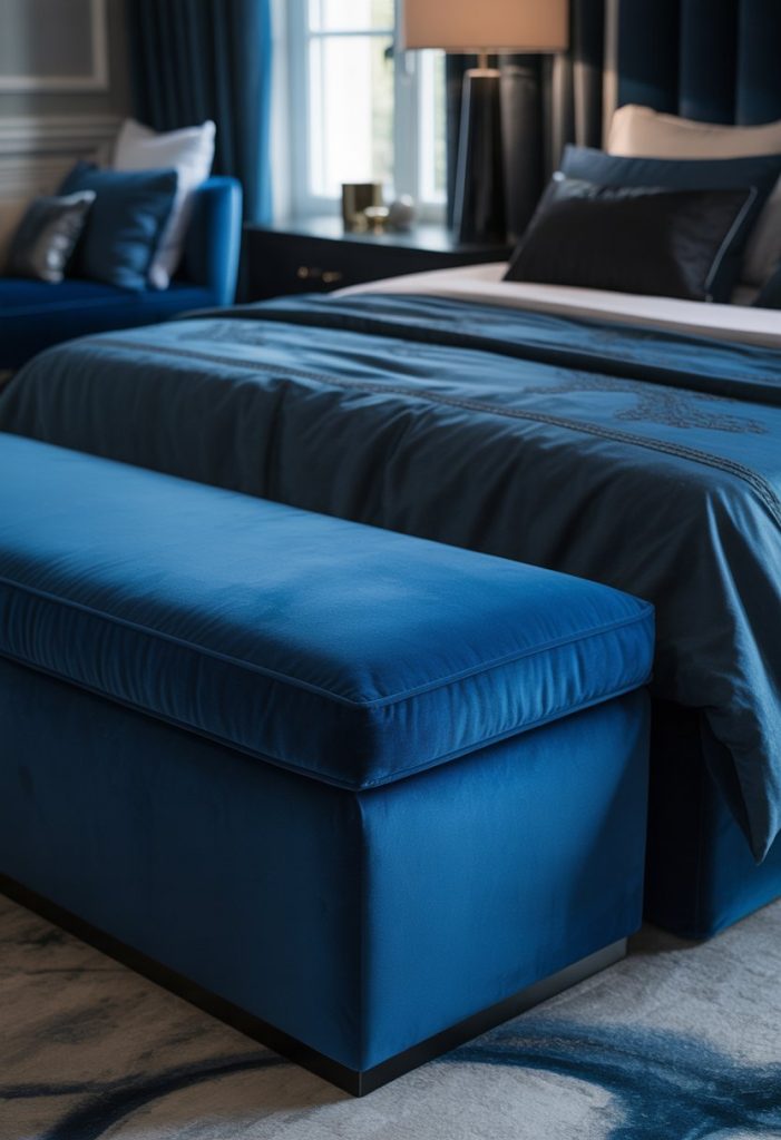 3. Royal Blue Velvet Bench at the Foot of the Bed