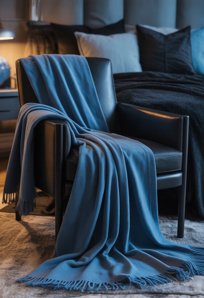 A blue throw blanket can turn a plain black leather chair into a cozy accent. The contrast between blue fabric and dark leather draws your eye.
