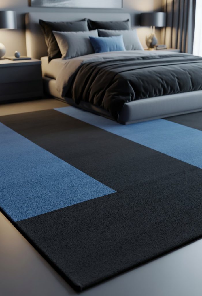 Most bedroom rugs are about 5×8 feet, but pick what fits. The blue and black combo feels calming but still sharp.