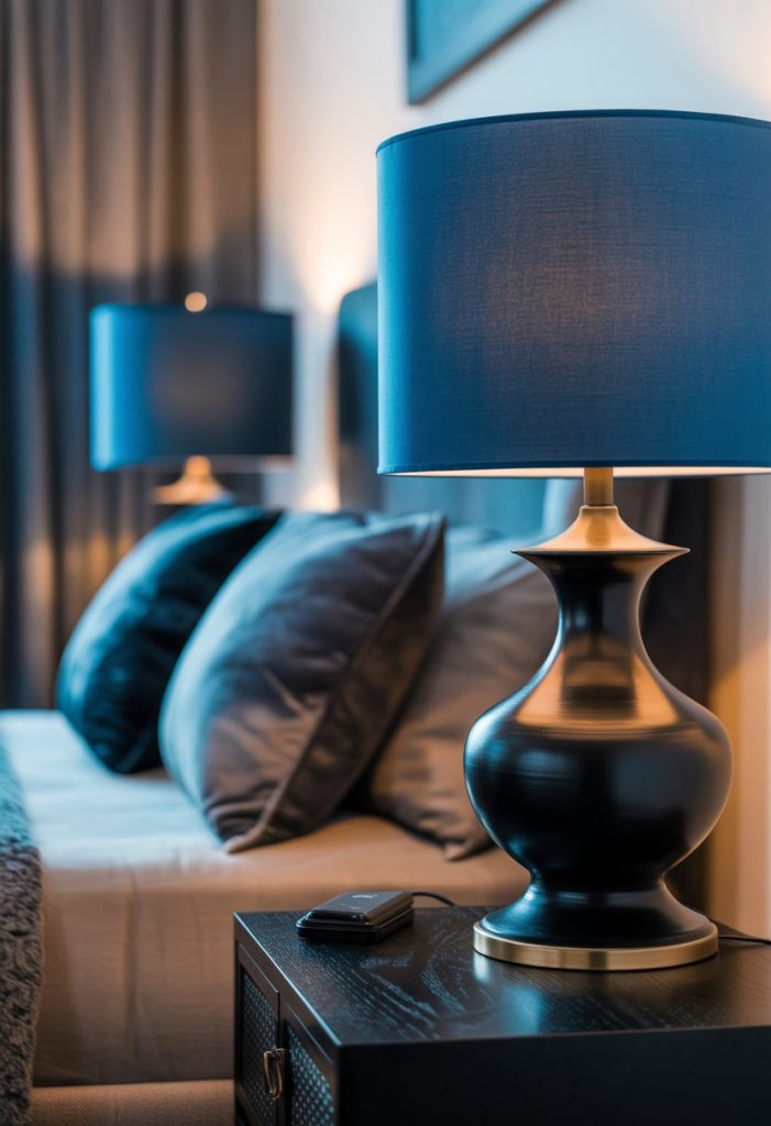 Midnight blue lampshades on black metal bases look sharp and a bit mysterious. This combo brings elegance and keeps the dark, moody vibe.