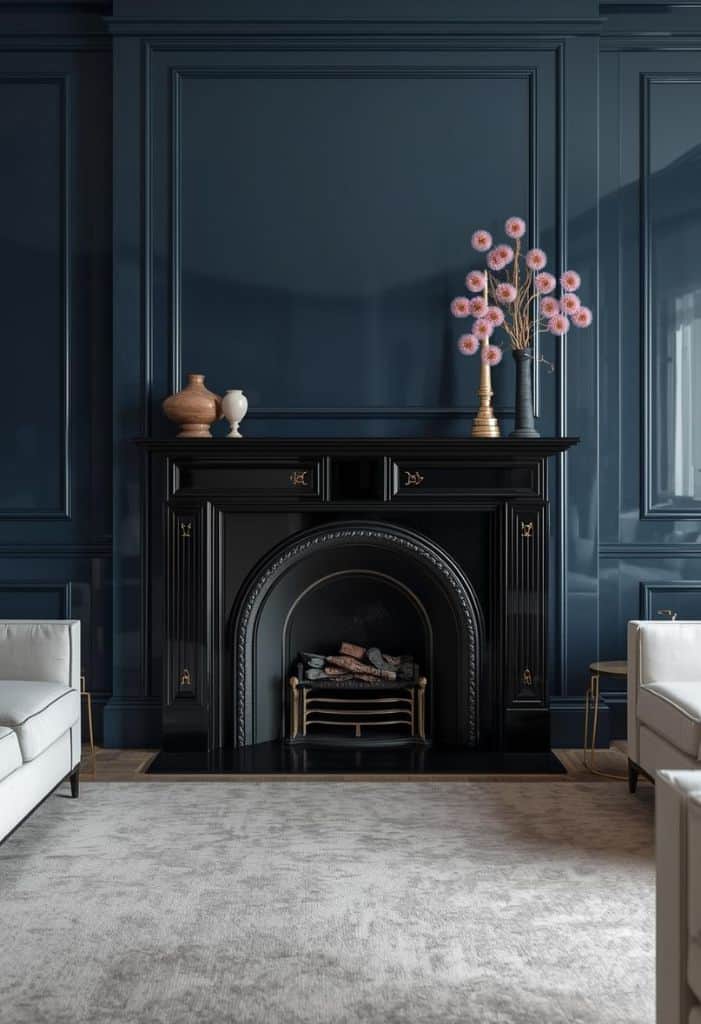 3. Black Fireplace Mantel Contrasted by Blue Lacquered Walls