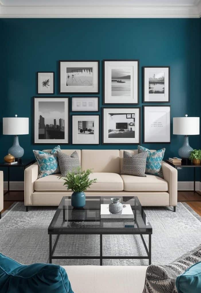 7. Black Framed Art with Teal Wall Accents for Color Pop