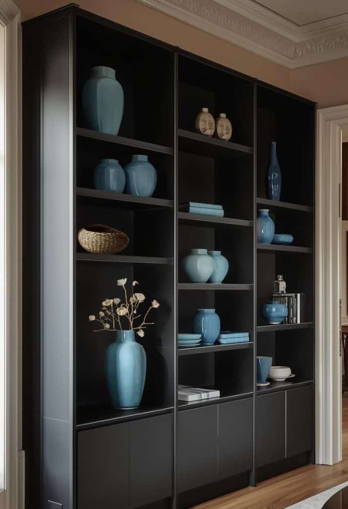 Black shelves make the perfect backdrop for blue vases. Mix shades from light blue to deep navy for variety.