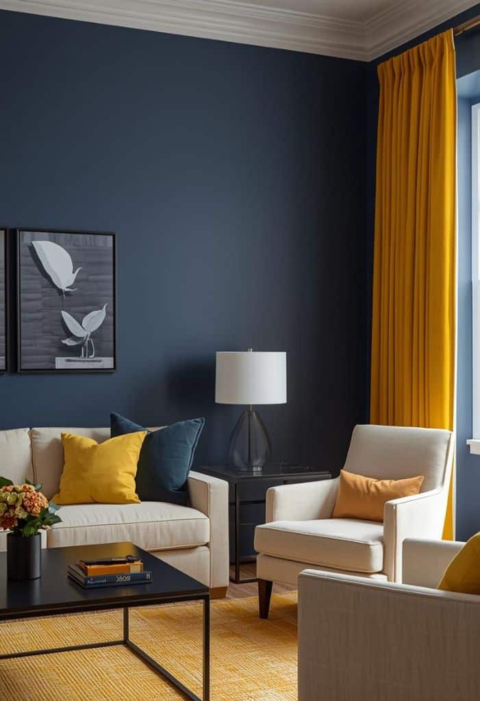 Hang vibrant yellow drapes against navy or royal blue walls. Mix in black frames, pillows, or a sleek coffee table to pull everything together.