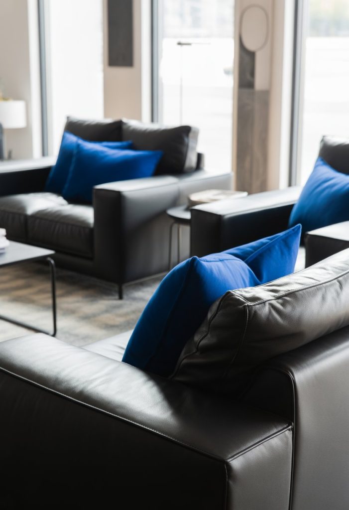 2. Black Leather Furniture with Royal Blue Throw Pillows