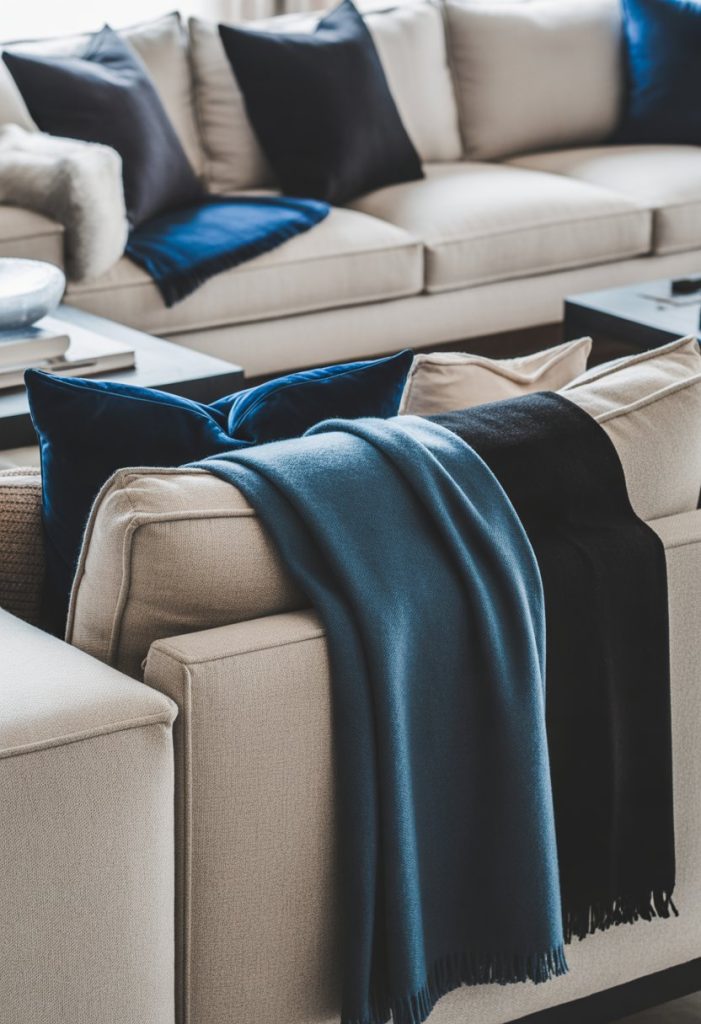 11. Blue and Black Throw Blankets Layered on Neutral Sofas