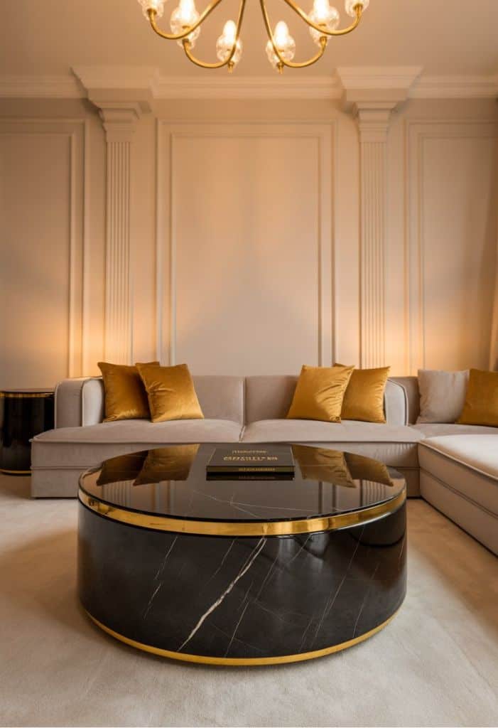 A black marble coffee table with gold trim is pure showstopper material. The dark marble looks luxurious, and the gold accents add just the right amount of warmth.