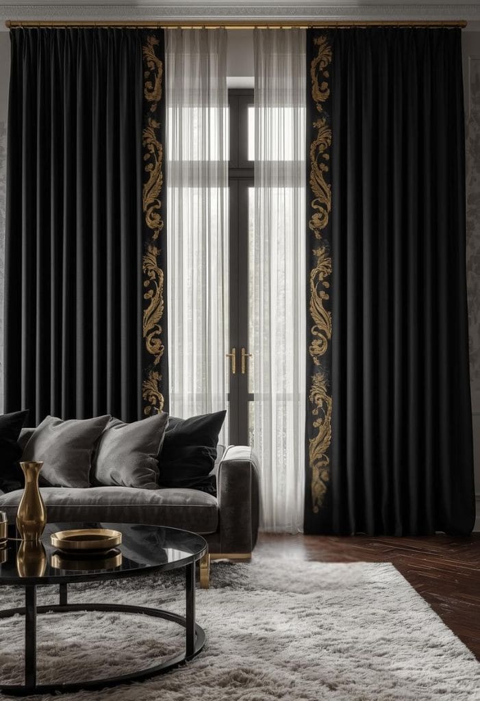 For extra flair, try black curtains with subtle gold patterns or tassels. This pairing is perfect for living rooms, dining areas, or bedrooms where you want to make a statement.