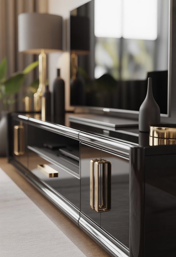 A black lacquered TV stand with gold handles brings instant glamour to your living room. This piece holds TVs up to 80 inches and offers plenty of storage.