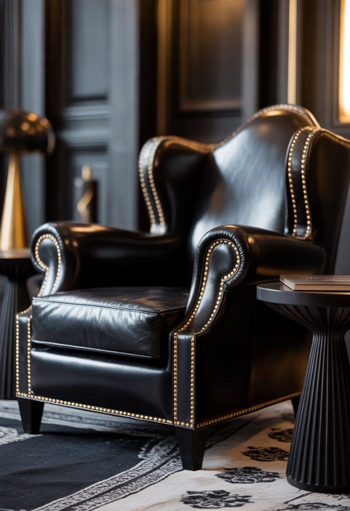 A black leather armchair with gold studs can steal the spotlight in your living room. The rich black leather and shiny gold accents create a look that’s both elegant and a little bit daring.