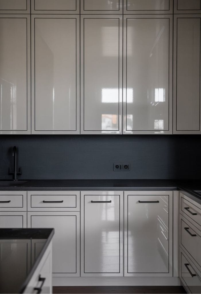 10. Glossy White Cabinets with Black Trim