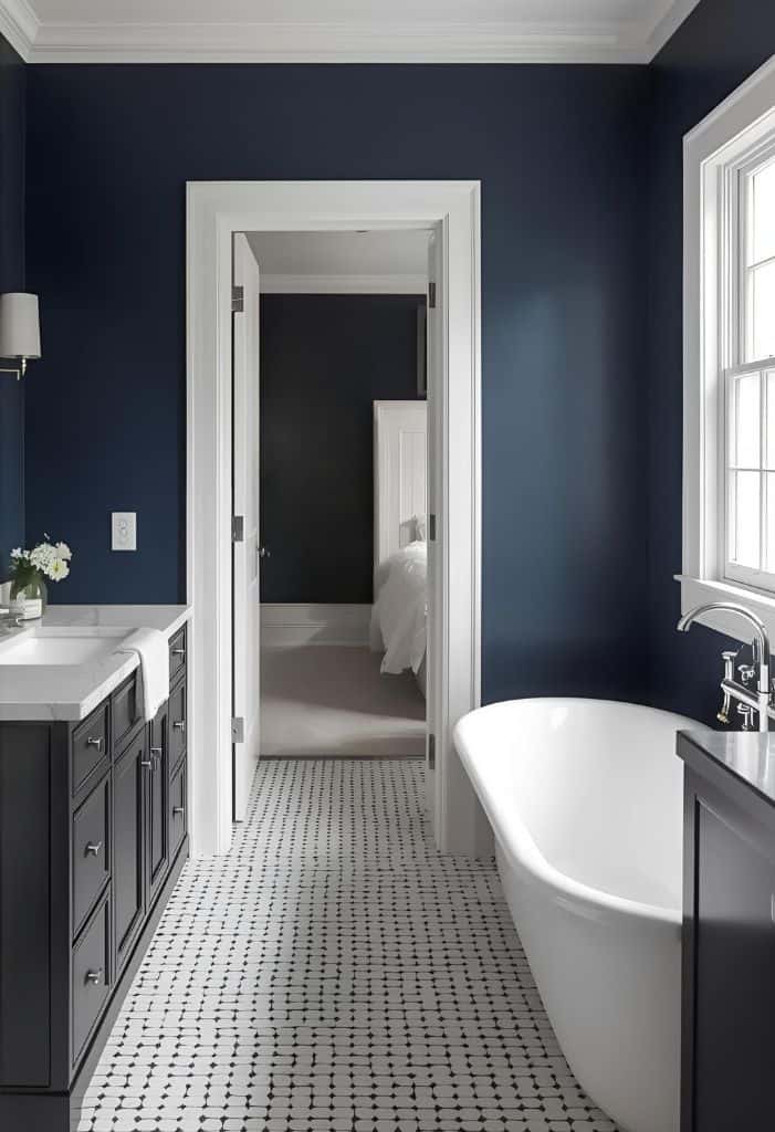 Navy blue walls with crisp white trim set a classic, elegant tone for your bathroom. This pairing brings a timeless nautical vibe that just works.