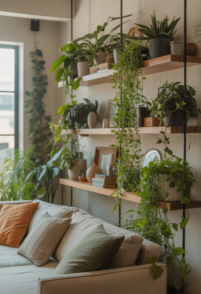 Let trailing plants spill over your shelves for that effortless cafe vibe. Pothos, string of pearls, or philodendrons work wonders—their vines naturally drape down.