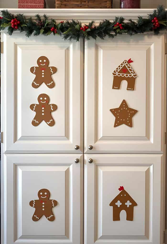Cut out classic gingerbread men, houses, or stars. Attach them to your cabinet doors using removable putty or command strips for easy cleanup after the holidays.