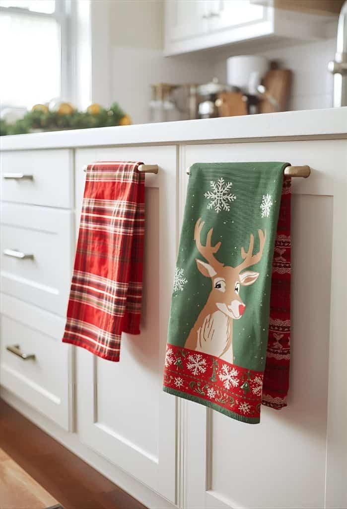Choose towels with cheerful patterns like snowflakes, trees, reindeer, or Santa that match your kitchen’s color scheme.