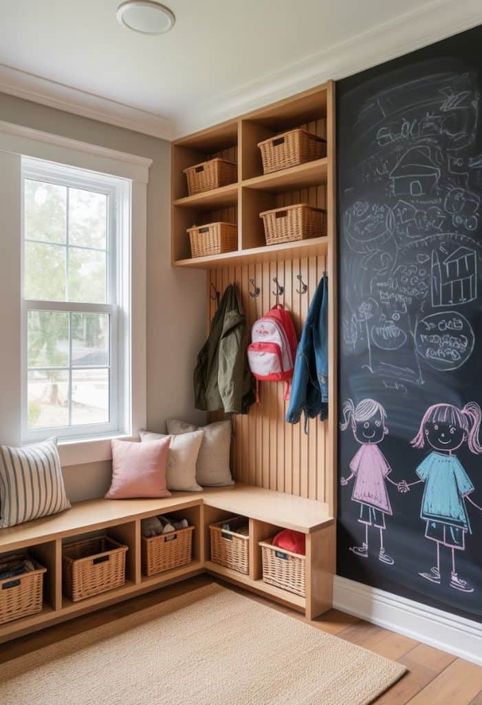 A chalkboard wall turns your mudroom into a spot for family messages. Jot down reminders or leave quick notes.