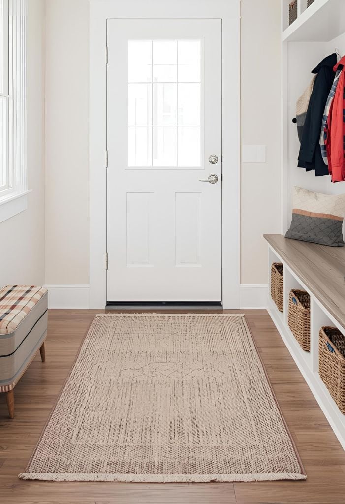 Rugs makes your mudroom feel cozier and more inviting. Add a couple of rugs to make it warmer underfoot.