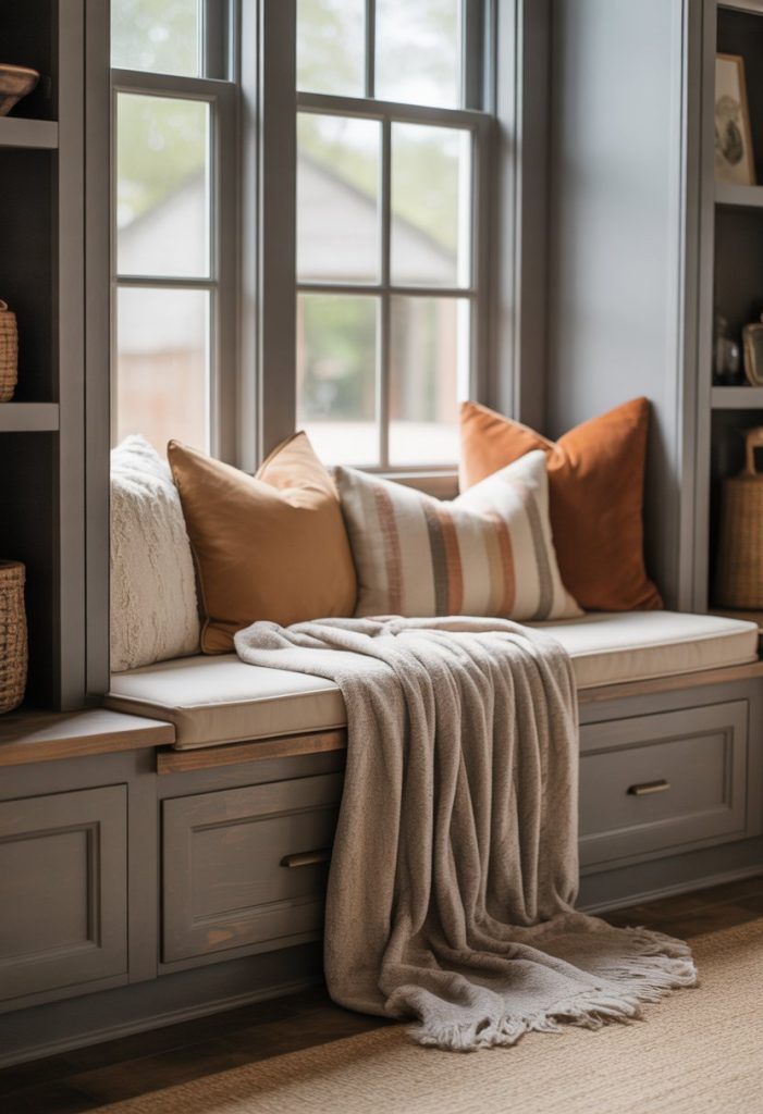 Make your window seat extra inviting with soft pillows and a throw blanket. It’s a nice spot to sit while putting on shoes or just taking a breather.
