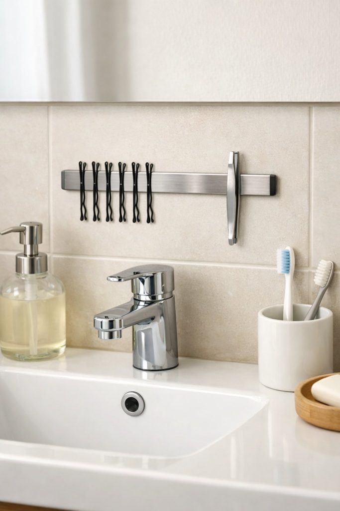 Bobby pins and tweezers seem to vanish in a shared bathroom. Stick a magnetic strip inside your cabinet door or on the wall.