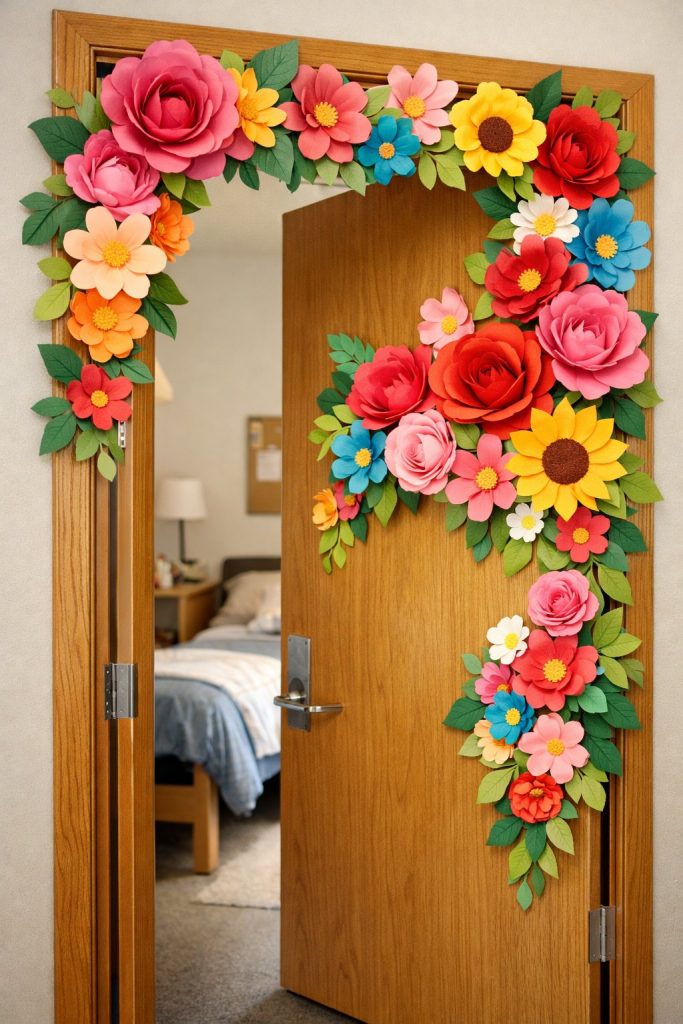Paper flowers add a burst of color to your door without costing much. Make them from craft paper in your favorite shades.