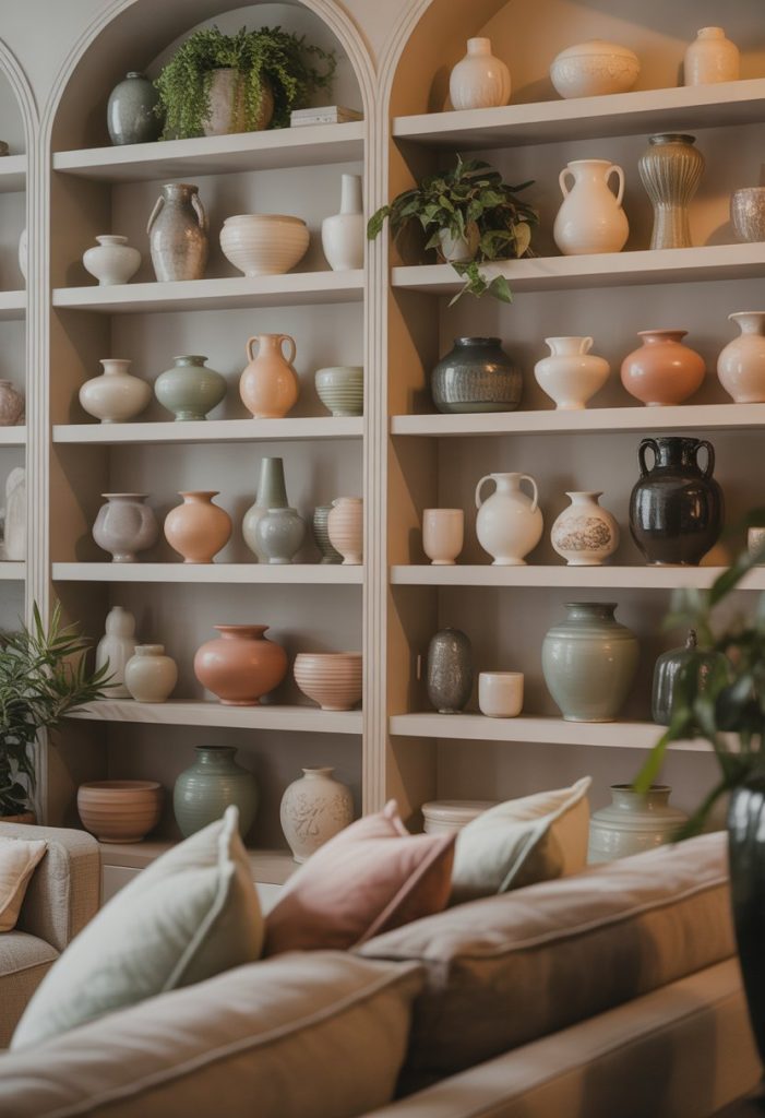 17. Open shelving with curated vintage pottery