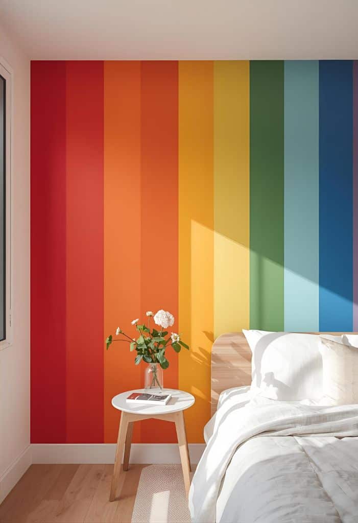 Want to add a burst of color to your room? Try painting bold rainbow stripes on your wall. This fun idea works great in bedrooms, playrooms, or even living spaces.