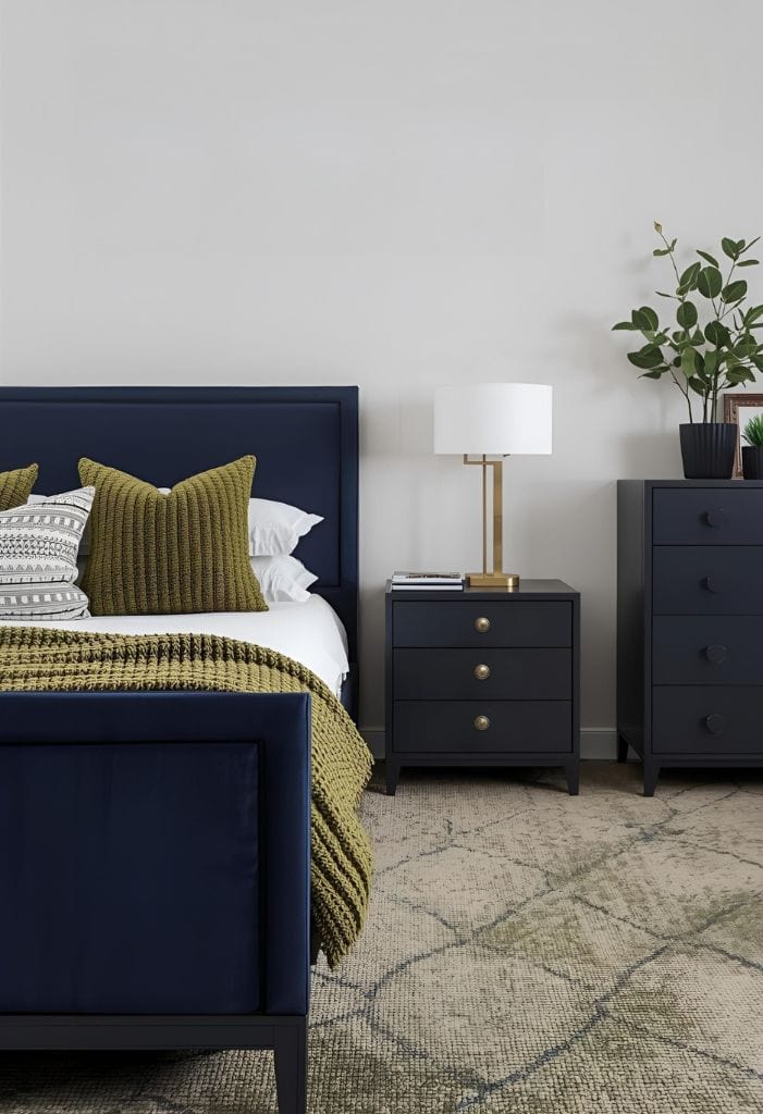 Add moss green with pillows, throws, or a cozy rug. These earthy green tones soften the deep navy and bring in a natural balance.