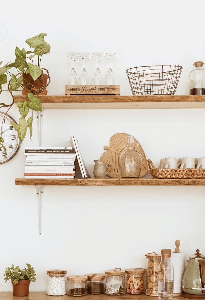 Reclaimed wood open shelving adds a rustic touch to your Japandi kitchen. You can find old barn wood or salvaged timber to create unique shelves.