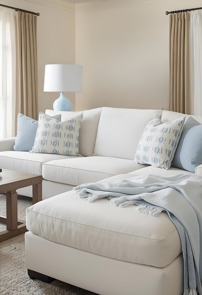 White works beautifully for the sofa itself. Sandy beige accents nearby keep things grounded.