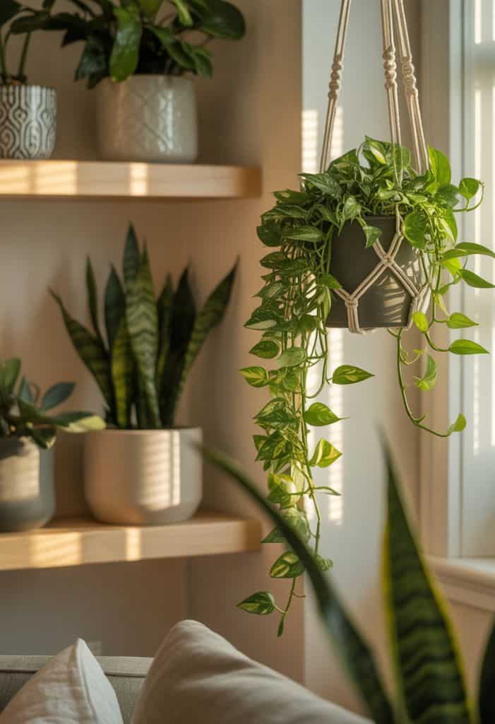 Plants instantly bring life to any living room. Pothos are perfect for renters—they thrive in low light and barely need attention.