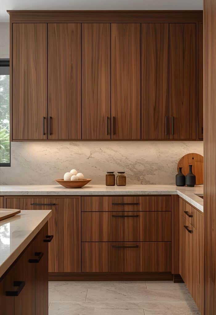 Walnut cabinets blend well with both traditional and modern designs. You can pair them with light countertops for contrast or stick with similar tones for a seamless look.
