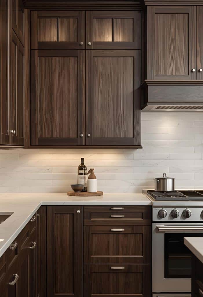 You can make espresso cabinets pop by pairing them with lighter countertops or backsplashes. This dark finish works in both modern and traditional kitchens.