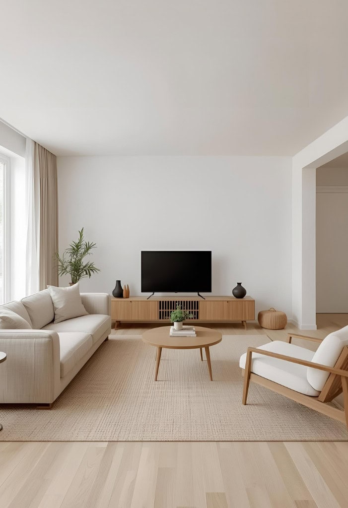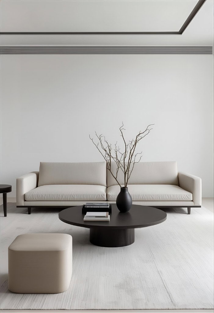 Mix up the textures. Maybe a wooden coffee table with stone coasters or vases? These organic touches feel inviting but still clean.
