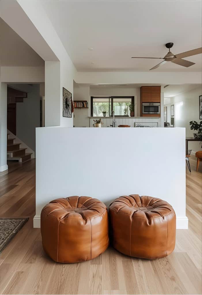 Leather poufs bring both style and function into your open-plan space. You can arrange these luxurious seating options next to low dividers, creating distinct zones without blocking light or views.