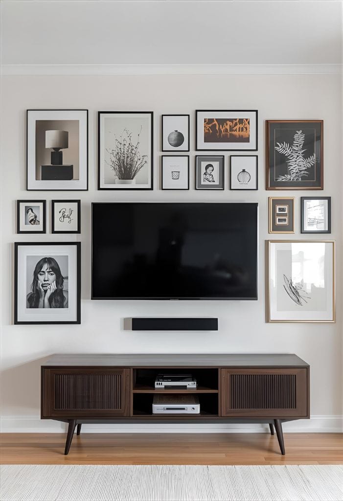 A gallery wall around your TV turns your entertainment area into a true focal point. Mix framed art, photos, and objects that show off your personality.