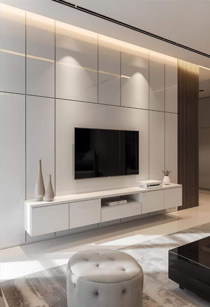 A glossy white TV wall unit gives your living room a clean, bright look. The reflective surface spreads light, making the space feel open and airy.